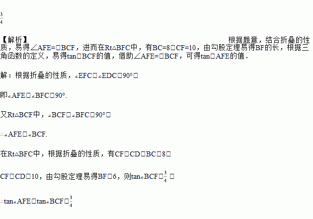 如图,矩形ABCD中,AB=10,BC=8,E为AD边上一点,沿CE将△CDE对折,使点D正好落在AB边上F处,求tan∠AFE.