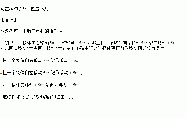 如果把一个物体向右移动5m记作移动-5m,那么这个物体又移动+5m是什么意思?这时物体离它两次移动前的位置多远?