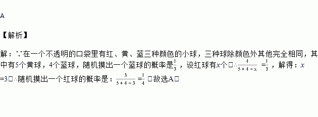 在一个不透明的口袋里有红、黄、蓝三种颜色的小球,这些球除颜色外都相同,其中有5个红球,4个蓝球.若随机摸出一个蓝球的概率为