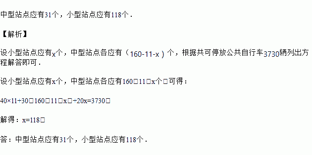 (列方程解决实际问题)安阳市政府为引导低碳生活、倡导绿色出行,于2015年11月1日起陆续投放公共自行车供市民出行免费使用,小明同学通过查阅资料发现:在这项惠民工程中,目前共建设大、中、小型三种公共自行车存放站点160个,共可停放公共自行车3730辆,其中每个大型站点可存放自行车40辆,每个中型站点可存放自行车30辆,每个小型站点可存放自行车20辆.已知大型站点有11个,则中、小型站点各应有多少个?