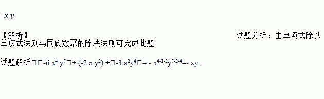 - x y 【解析】试题分析:由单项式除以单项式法则与同底数幂的除法法则可完成此题 试题解析:(-6 x4 y7)÷ (-2 x y2) ÷(-3 x2y4)= - x4-1-2y7-2-4=- xy.