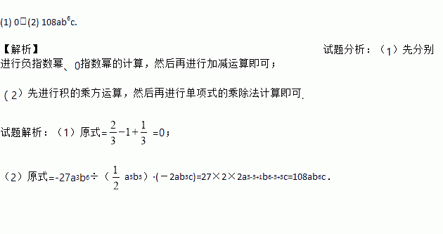 (1) -(π-2018)0+3-1; (2)(-3ab2)3÷(a3b3)·(-2ab3c).