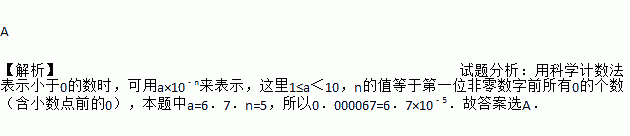 某种细胞的直径是0.000067厘米,将0.000067用科学记数法表示为( )
