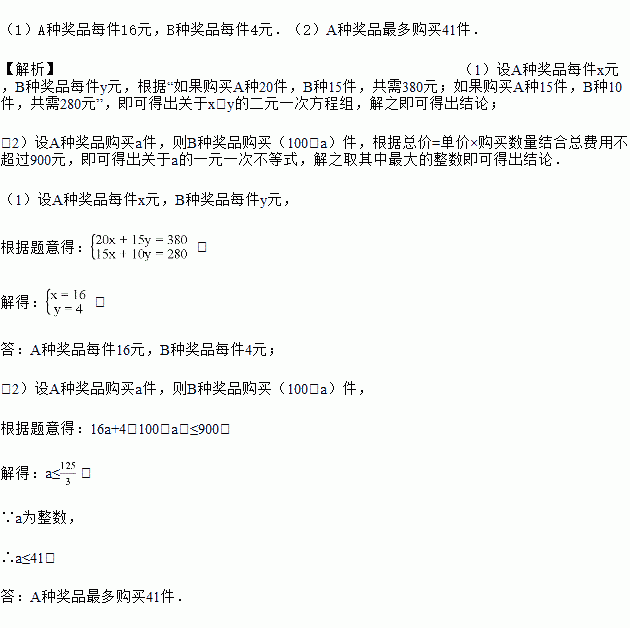 (2)现要购买A、B两种奖品共100件,总费用不超过900元,那么A种奖品最多购买多少件?
