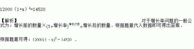 向阳村2015年的人均收入为12000元,2017年的人均收入为14520元. 若人均收入的年平均增长率为x, 根据题意,所列的方程为____________________________.
