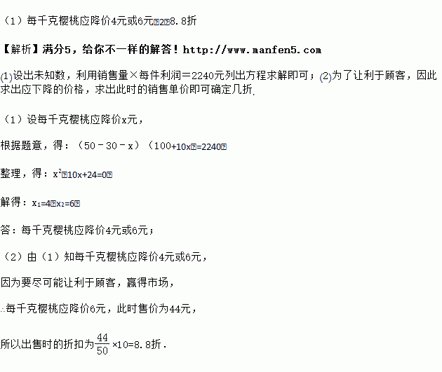新泰特产专卖店销售樱桃,其进价为每千克30元,按每千克50元出售,平均每天可售出100千克,后来经过市场调查发现,单价每降低1元,则平均每天的销售量可增加10千克,若该专卖店销售这种樱桃想要平均每天获利2240元,请回答: