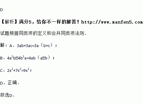 A. 3ab+3ac=6abc B. 4a2b﹣4b2a=0 C. 2x2+7x2=9x4 D. 3y2﹣2y2=y2