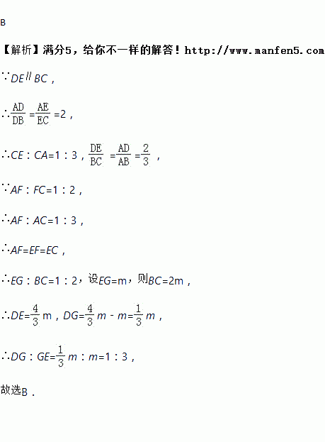 如图,已知在△ABC中,点D、E分别在边AB、AC上,DE∥BC,AD:BD=2:1,点F在AC上,AF:FC=1:2,联结BF,交DE于点G,那么DG:GE等于( )