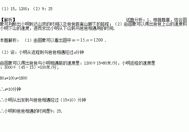 小明和爸爸周末到湿地公园进行锻炼,两人上午9:00从公园入口出发,沿相同路线匀速运动,小明15分钟后到达目的地,此时爸爸距出发地1200米,小明到达目的地后立即按原路匀速返回,与爸爸相遇后,和爸爸一起从原路返回出发地.小明、爸爸在锻炼过程中离出发地的路程与小明出发的时间的函数关系如图.