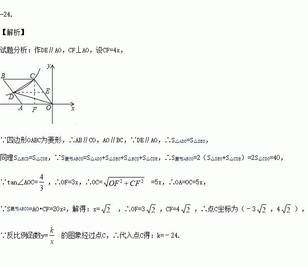 如图,菱形的一边在轴的负半轴上,是坐标原点,,反比例函数的图像经过点,与交于点,若的面积为20,则的值等于 .