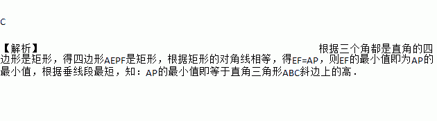 C 【解析】根据三个角都是直角的四边形是矩形,得四边形AEPF是矩形,根据矩形的对角线相等,得EF=AP,则EF的最小值即为AP的最小值,根据垂线段最短,知:AP的最小值即等于直角三角形ABC斜边上的高.