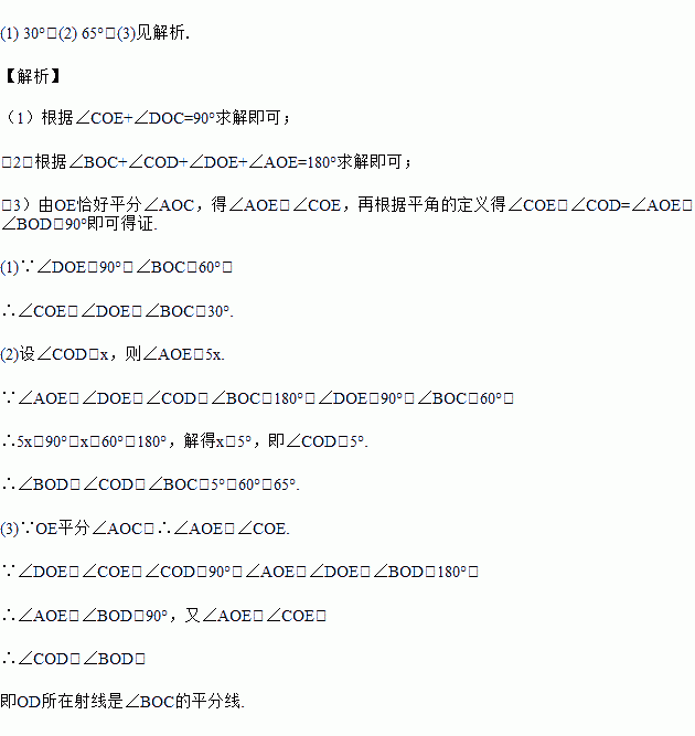 (2)如图②,将三板DOE绕O逆时针转动到某个位置时,若恰好满足5∠COD=∠AOE,且∠BOC=60°,求∠BOD的度数;