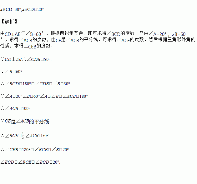 在△ABC中,CD⊥AB于D,CE是∠ACB的平分线,∠A=20°,∠B=60°.求∠BCD和∠ECD的度数.