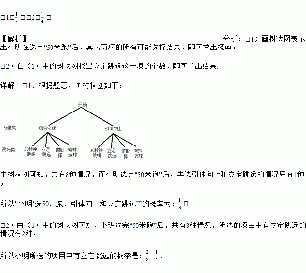 £¨1£©ÇëÓûÊ÷״ͼ»òÁбíµÄ·½·¨Çó¡°Ð¡Ã÷¡®Ñ¡50Ã×ÅÜ¡¢ÒýÌåÏòÉϺÍÁ¢¶¨ÌøÔ¶¡¯¡±µÄ¸ÅÂÊ£»