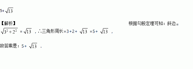 一个直角三角形,两直角边长分别为3和2,则三角形的周长为________.