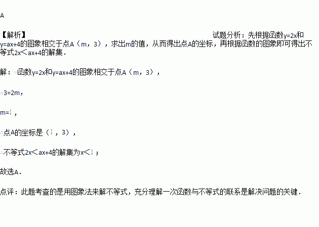 如图,函数y=2x和y=ax+4的图象相交于点A(m,3),则不等式2x<ax+4的解集为( )
