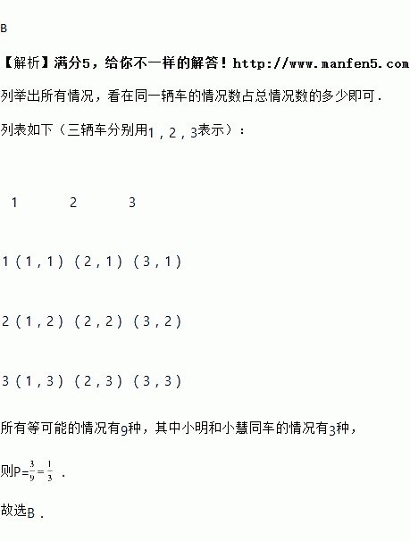 学校组织春游,安排九年级三辆车,小明和小慧都可以从这三辆车中任选一辆搭乘,小明和小慧同车的概率是( )