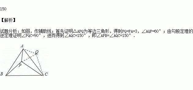 等边△ABC内有一点P,且PA=3,PB=4,PC=5,则∠APB= 度.