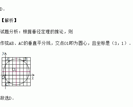 如图,在平面直角坐标系中,点A、B、C的坐标为(1,4)、(5,4)、(1、),则△ABC外接圆的圆心坐标是( )