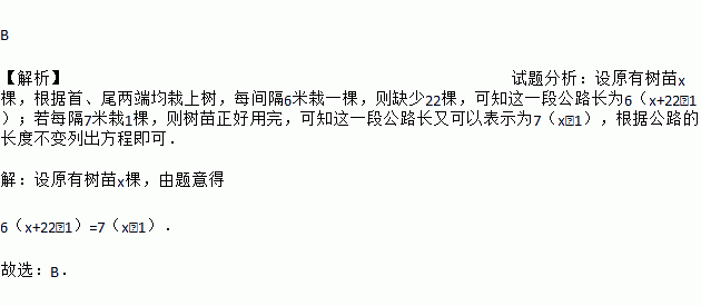 B 【解析】试题分析:设原有树苗x棵,根据首、尾两端均栽上树,每间隔6米栽一棵,则缺少22棵,可知这一段公路长为6(x+22﹣1);若每隔7米栽1棵,则树苗正好用完,可知这一段公路长又可以表示为7(x﹣1),根据公路的长度不变列出方程即可. 【解析】 设原有树苗x棵,由题意得 6(x+22﹣1)=7(x﹣1). 故选:B.
