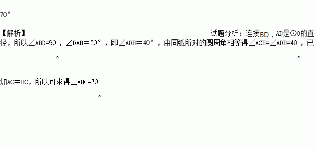 如图,AD是⊙O的直径,△ABC是⊙O的内接三角形,已知AC=BC,∠DAB=50°,则∠ABC=________.