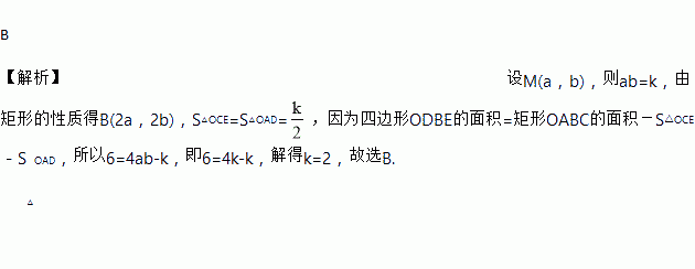 如图,反比例函数 (x>0)的图象经过矩形OABC对角线的交点M,分别与AB,BC交于点D,E,若四边形ODBE的面积为6,则k的值为( )