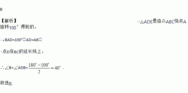 B 【解析】∵△ADE是由△ABC绕点A旋转100°得到的, ∴∠BAD=100°,AD=AB, ∵点D在BC的延长线上, ∴∠B=∠ADB=. 故选B.