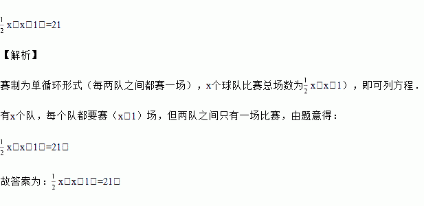 为增强学生身体素质,提高学生足球运动竞技水平,我市开展“市长杯”足球比赛,赛制为单循环形式(每两队之间赛一场).现计划安排21场比赛,应邀请多少个球队参赛?设邀请x个球队参赛,根据题意,可列方程为_____.