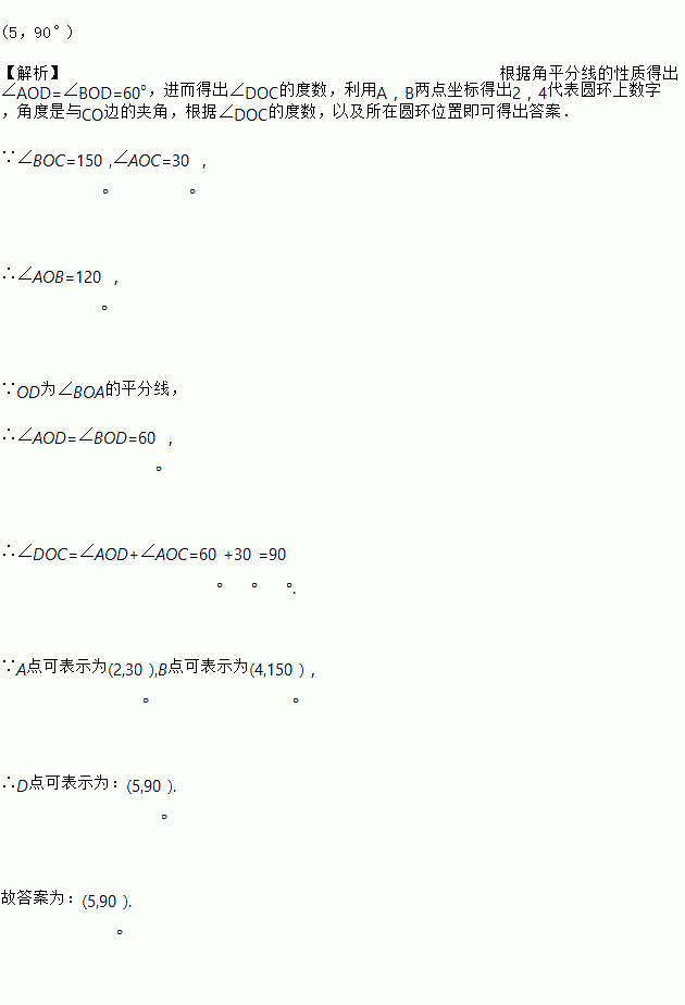 如图,已知∠AOC=30°,∠BOC=150°,OD为∠BOA的平分线,则∠DOC=90°.若A点可表示为(2,30°),B点可表示为(4,150°),则D点可表示为________.