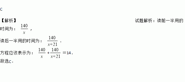 暑假期间,赵强同学借了一本书,共280页,要在两周借期内读完,当他读了一半时,发现平时每天要多读21页,才能在借期内读完,他读了前一半时,平均每天读多少页?如果设读前一半时,平均每天读x页,则下面所列方程中正确的是( )