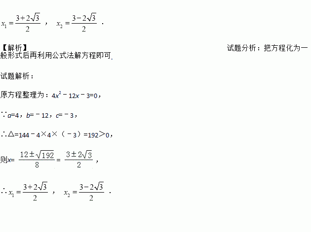 , . 【解析】试题分析:把方程化为一般形式后再利用公式法解方程即可. 试题解析: 原方程整理为:4x2﹣12x﹣3=0, ∵a=4,b=﹣12,c=﹣3, ∴△=144﹣4×4×(﹣3)=192>0, 则x= = , ∴, .