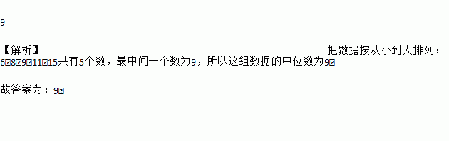 9 【解析】把数据按从小到大排列:6,8,9,11,15共有5个数,最中间一个数为9,所以这组数据的中位数为9, 故答案为:9.