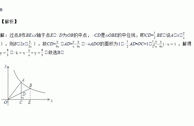 如图,A,B是双曲线y=(k≠0)上的两点,过点A作AC⊥x轴,交OB于点D,垂足为C.若△ADO的面积为1,D为OB的中点,则k的值为( )