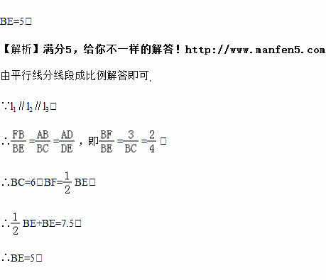 如图,l1∥l2∥l3,AB=3,AD=2,DE=4,EF=7.5.求BC、BE的长.