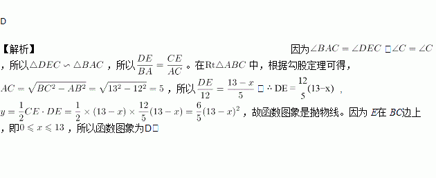已知:如图,Rt△ABC中,∠BAC=90°,BC=13,AB=12,E是BC边上一点,过点E作DE⊥BC,交AC所在直线于点D,若BE=x,△DCE的面积为y,则y与x的函数图象大致是( )