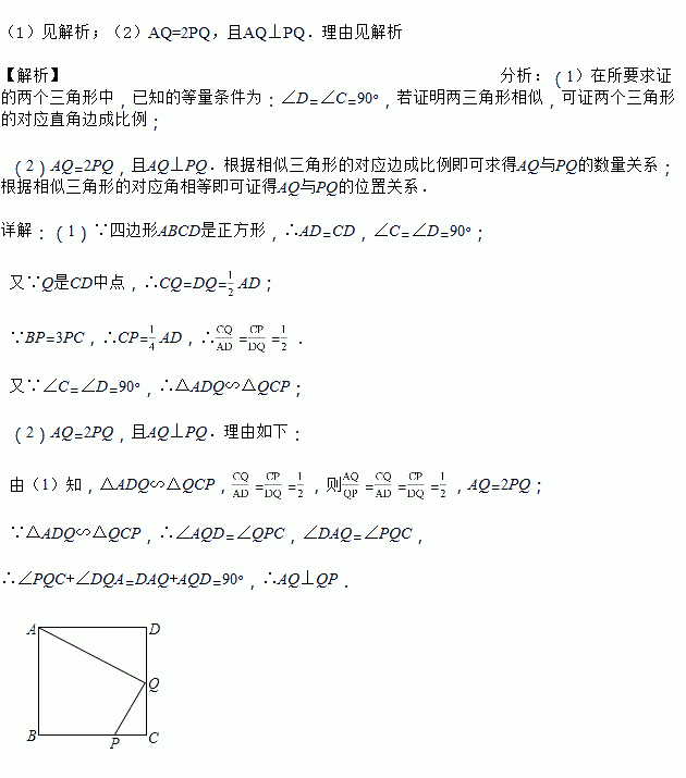 (1)求证:△ADQ∽△QCP.