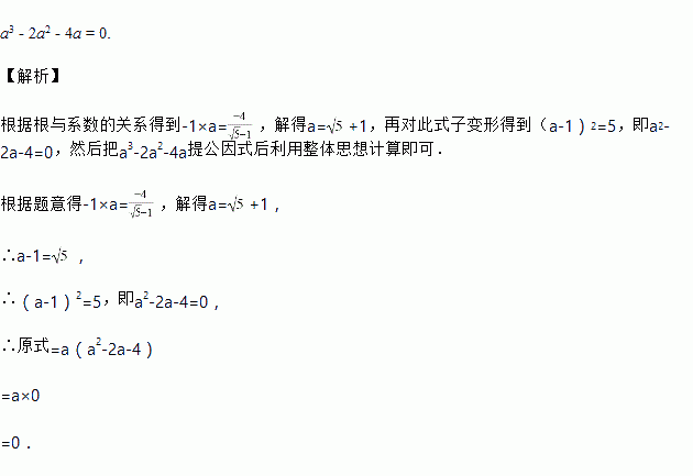 已知方程()x2 + ()x - 4 = 0的一个根是-1,设另一个根为a, 求a3 - 2a2 - 4a的值.