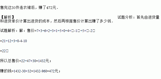 售完这30件连衣裙后,赚了472元. 【解析】试题分析:首先由进货量和进货单价计算出进货的成本,然后再根据售价计算出赚了多少钱. 试题解析:【解析】 售价=7×3+6×2+3×1+5×0+4×(-1)+5×(-2) =21+12+3+0-4-10 =22; 所以总售价=22+47×30=1432元; 赚的钱=1432-30×32=1432-960=472元; ...