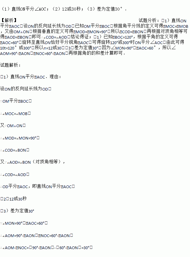 (1)直线ON平分∠AOC;(2)12或30秒;(3)差为定值30°. 【解析】试题分析:(1)直线ON平分∠AOC,设ON的反向延长线为OD,已知OM平分∠BOC,根据角平分线的定义可得∠MOC=∠MOB,又由OM⊥ON,根据垂直的定义可得∠MOD=∠MON=90°,所以∠COD=∠BON,再根据对顶角相等可得∠AOD=∠BON,即可∴∠COD=∠AOD,结论得证;(1)已知∠BOC=12...