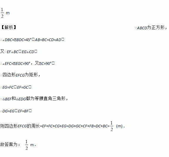 如图,在正方形ABCD中,E是对角线BD上任意一点,过E作EF⊥BC于F,作EG⊥CD于G,若正方形ABCD的周长为1m,则四边形EFCG的周长为________.