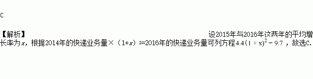 某市2014年的快递业务量为4.4亿件,受益于电子商务发展和法治环境改善等多重因素,快递业务迅猛发展.若2016年的快递业务量达到9.7亿件,设2015年与2016年这两年的平均增长率为x,则下列方程正确的是()
