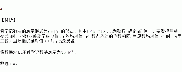 3月22日,美国宣布将对约600亿美元进口自中国的商品加征关税,中国商务部随即公布拟对约30亿美元自美进口商品加征关税,并表示,中国不希望打贸易战,但绝不惧怕贸易战,有信心,有能力应对任何挑战.将数据30亿用科学记数法表示为( )