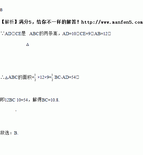 如图,AD,CE是△ABC的两条高,已知AD=10,CE=9,AB=12,则BC的长是( )
