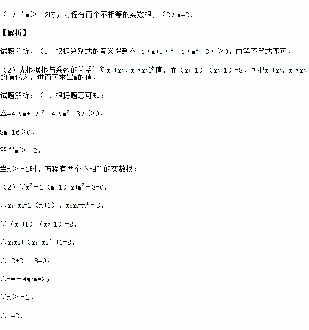 (1)当m>﹣2时,方程有两个不相等的实数根;(2)m=2. 【解析】 试题分析:(1)根据判别式的意义得到△=4(m+1)2﹣4(m2﹣3)>0,再解不等式即可; (2)先根据根与系数的关系计算x1+x2,x1•x2的值,而(x1+1)(x2+1)=8,可把x1+x2,x1•x2的值代入,进而可求出m的值. 试题解析:(1)根据题意可知: △=4(m+1)2﹣4(m...