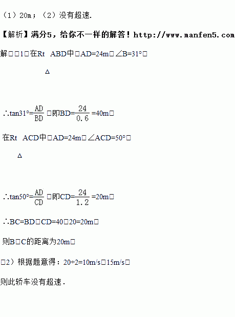 据调查,超速行驶是引发交通事故的主要原因之一,所以规定以下情境中的速度不得超过15m/s,在一条笔直公路BD的上方A处有一探测仪,如平面几何图,AD=24m,∠D=90°,第一次探测到一辆轿车从B点匀速向D点行驶,测得∠ABD=31°,2秒后到达C点,测得∠ACD=50°(tan31°≈0. 6,tan50°≈1.2,结果精确到1m)