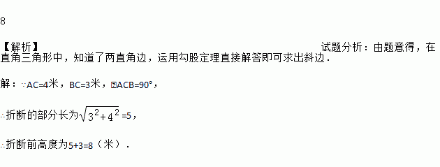 如图,今年的冰雪灾害中,一棵大树在离地面3米处折断,树的顶端落在离树杆底部4米处,那么这棵树折断之前的高度是_____米.