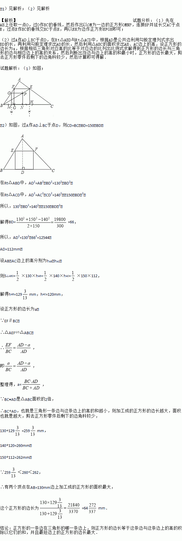 (2)锐角△ABC是一块三角形余料,边AB=130mm,BC=150mm,AC=140mm,要把它加工成正方形零件,使正方形的一边在三角形的一边上,其余两个顶点分别在另外两条边上,且剪去正方形零件后剩下的边角料较少,这个正方形零件的边长是多少?你能得出什么结论,并证明你的结论.