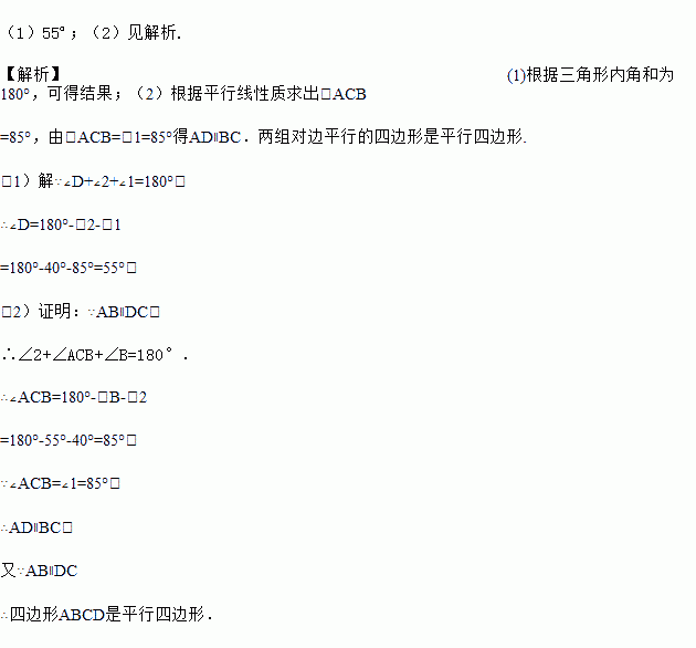 如图,四边形ABCD, AB//DC, ∠B=55,∠1=85,∠2=40