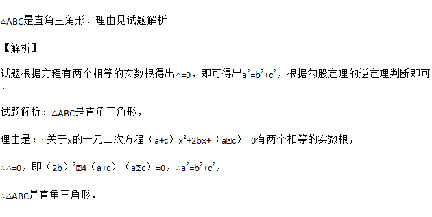 已知关于x的一元二次方程(a+c)x2+2bx+(a﹣c)=0,其中a、b、c分别为△ABC三边的长.若方程有两个相等的实数根,试判断△ABC的形状,并说明理由.