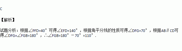 如图,AB∥CD,直线PQ分别交AB,CD于点E,F,FG是∠EFD的平分线,交AB于点G.若∠PFD=40°,那么∠FGB等于( )